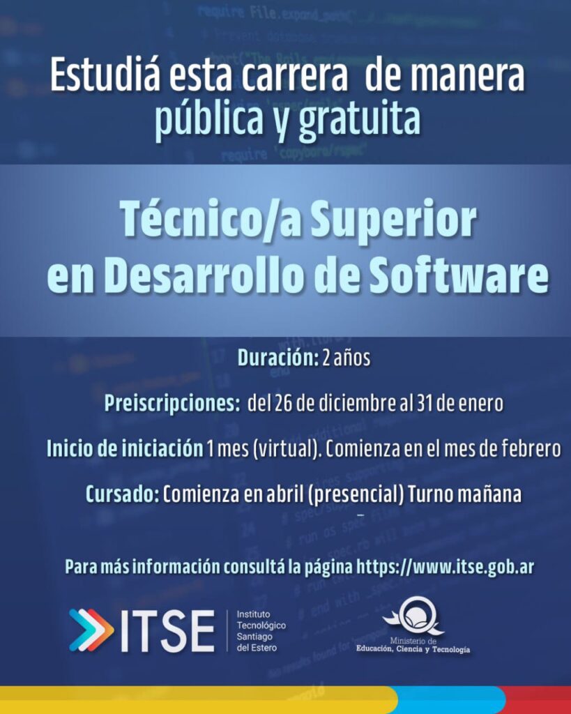 El Instituto Tecnológico de Santiago del Estero, dependiente del Ministerio de Educación, Ciencia y Tecnología de la provincia, abrió su oferta educativa para el Ciclo Lectivo 2026 para todos los interesados en cursar las tecnicaturas superiores en Desarrollo de Software; en Ciencia de Datos e Inteligencia Artificial y en Biotecnología.