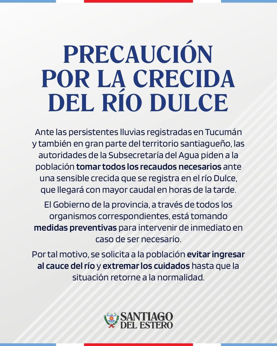 Ante las persistentes lluvias registradas en Tucumán y también en gran parte del territorio santiagueño, las autoridades de la Subsecretaría del Agua piden a la población tomar todos los recaudos necesarios ante una sensible crecida que se registra en el río Dulce, que llegará con mayor caudal en horas de la tarde. El Gobierno de la provincia, a través de todos los organismos correspondientes, está tomando medidas preventivas para intervenir de inmediato en caso de ser necesario. Por tal motivo, se solicita a la población evitar ingresar al cauce del…